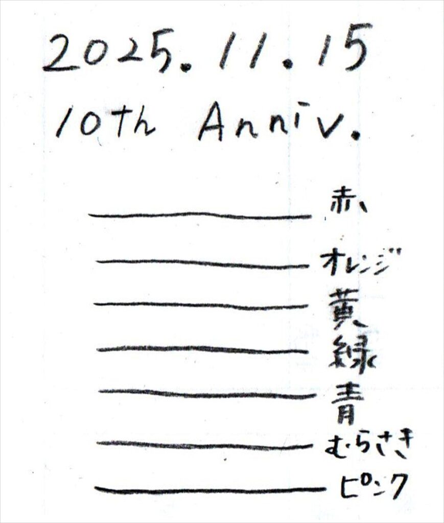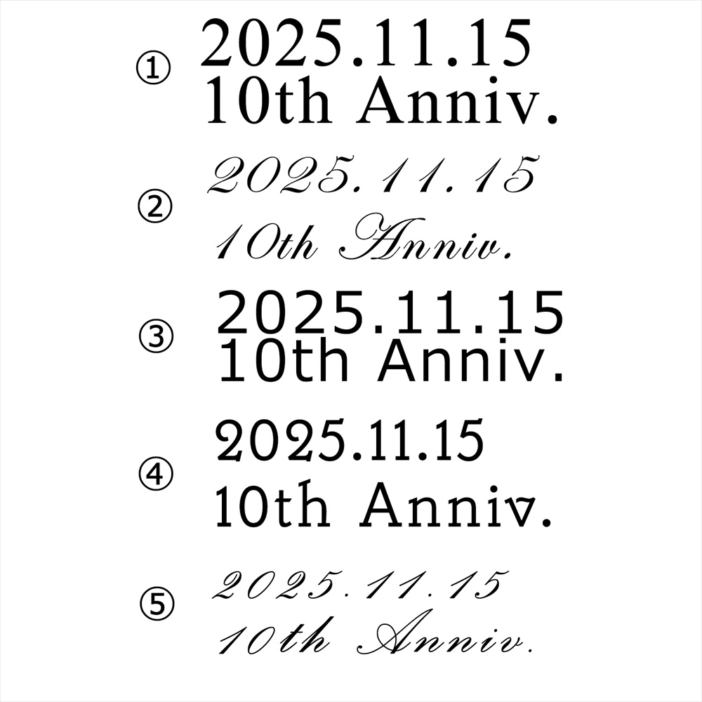 レーザー焼印 :(1行目)2025.11.15/(2行目)10th Anniv.【希望フォント番号】/加工場所:見開き内側の左部分上