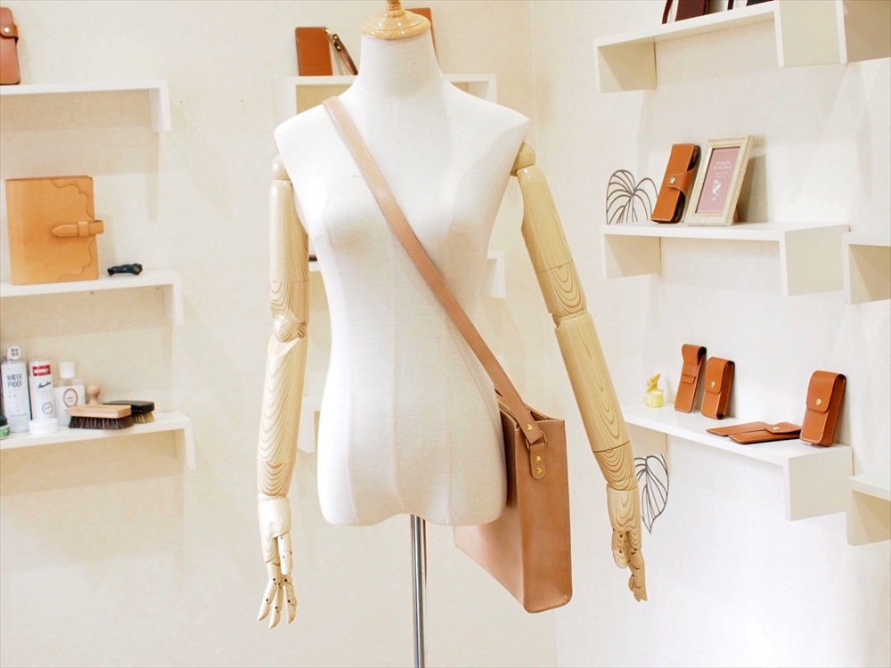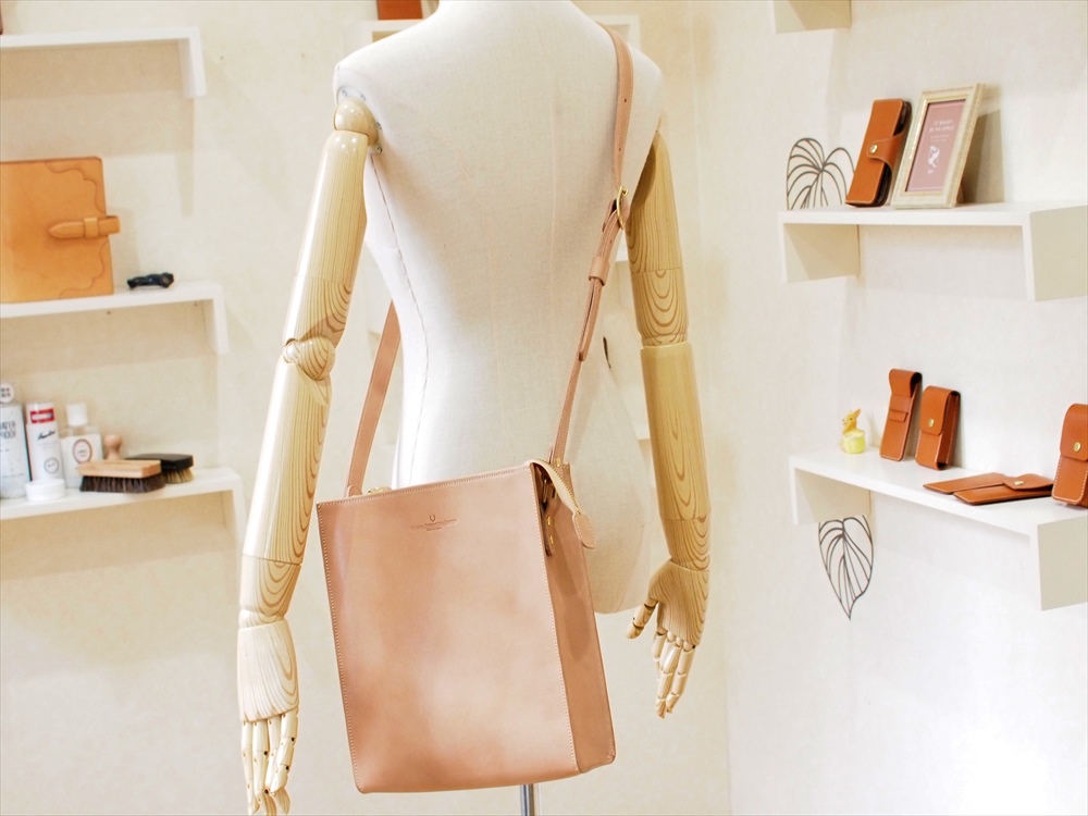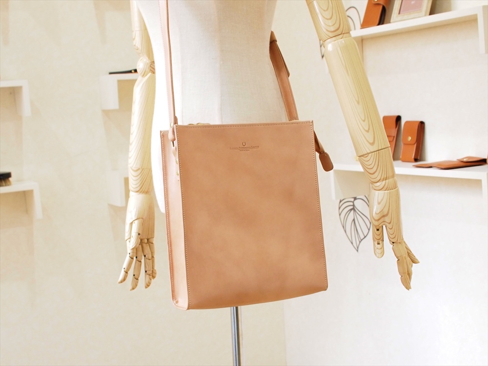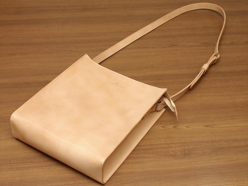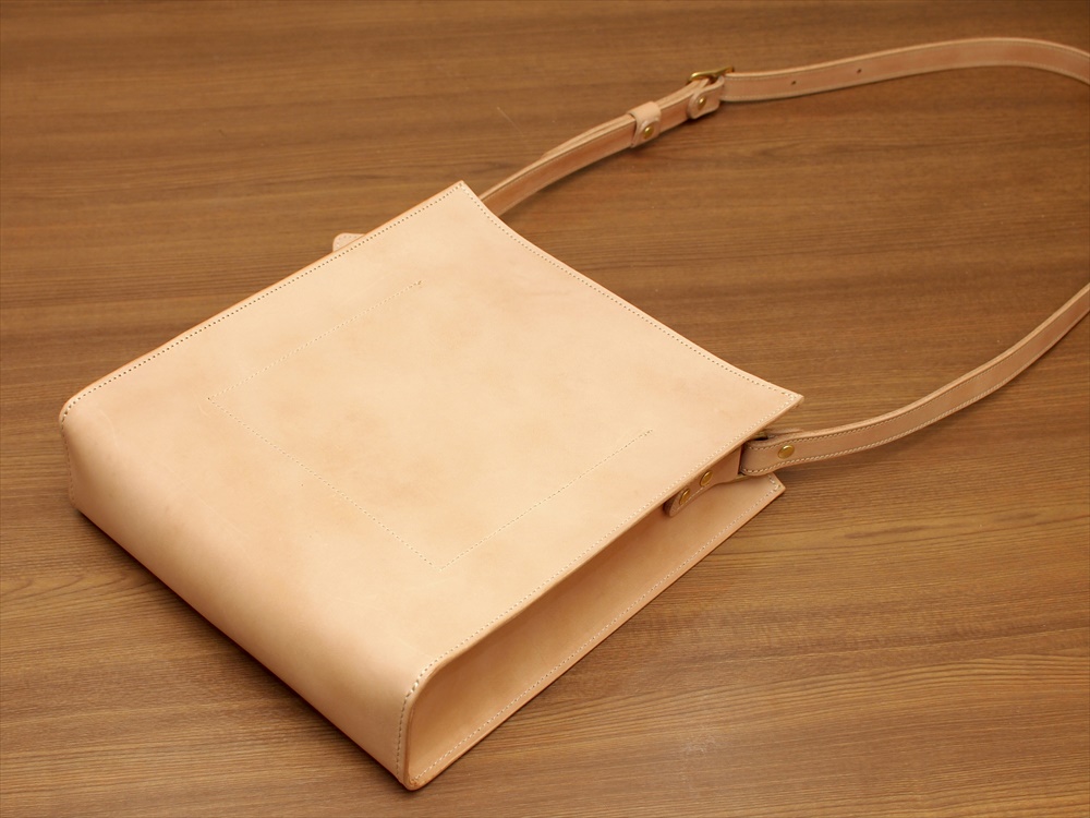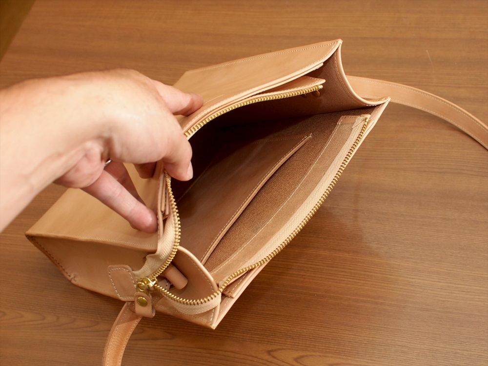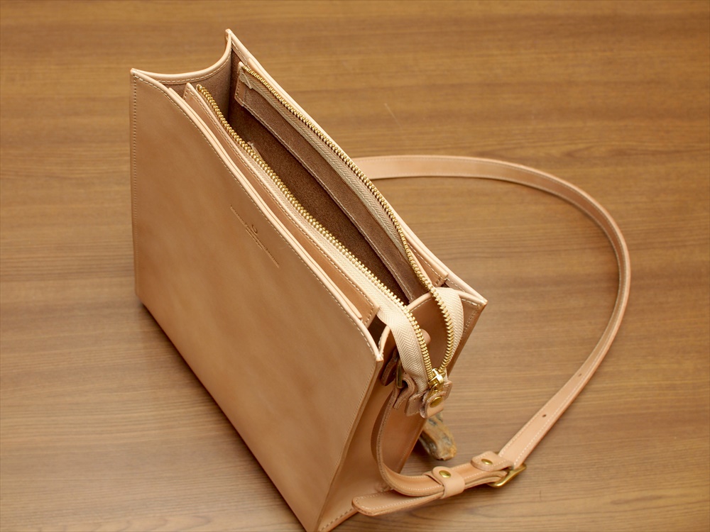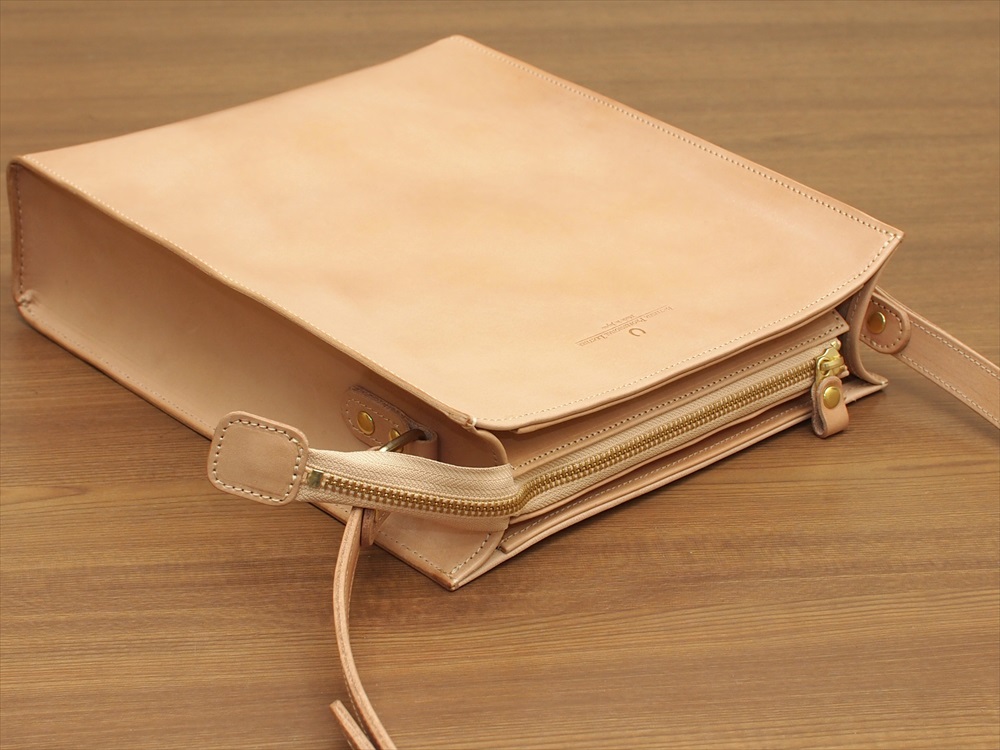 OM-438 栃木レザーナチュラルヌメ牛革のA4サイズが収納できる縦型ショルダーバッグ ファスナー開口