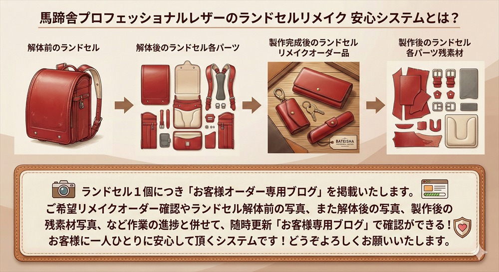 馬蹄舎プロフェッショナルレザーの「ランドセルリメイク」では、大切なランドセルを、新たなアイテムとして誕生させます。思い出はそのまま、新しいストーリーをつなぐリメイク体験を。さあ!ランドセルに新しい命を吹き込みませんか?